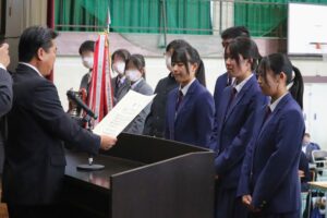 続いて、倉商祭結団式が行われました。各ブロックのブロック長・副ブロック長・パフォーマンスリーダー・バックリーダーから自己紹介と意気込みが述べられました。「3年生最後の年なので優勝を目指し頑張りたい。」「団長をしっかり支え頑張りたい。」「自分のブロックにふさわしい応援パフォーマンスを贈りたい。」「ブロックにふさわしいテーマで応援を盛り上げたい。」など各ブロックの抱負が述べられました。生徒会から「約2か月後に開催される倉商祭に各ブロック協力して盛り上げよう!」とスローガンが発せられました。思い出に残る『倉商祭』になるようみなさん協力して頑張りましょう。