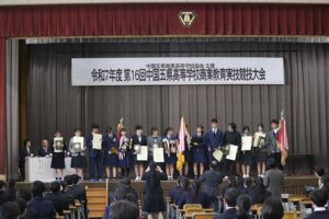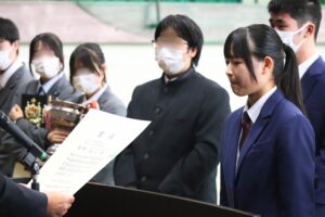 本来なら期末考査最終日を迎え、暑い夏に向けての壮行式や倉商祭結団式の予定でしたが、期末考査初日の大雨の影響で、初日の考査日程は1週間延期され、週明けの月曜日まで期末考査を1日残して行事は変更されました。本日の「表彰伝達・壮行式」の内容が非常に多いため、第1学期終業式直後に全国大会・中国大会へ出場される部活動のみに限定し、表彰伝達のみの部活動は先送りされています。多くの部活動から多数の表彰伝達が行われました。