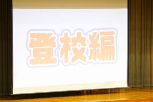 最初に「倉商紹介」で、倉商生活でのルール違反を生徒会の人たちによるビデオ撮影により、「5分前登校」「倉商カバン」「制服の着こなし」や「食堂の利用方法」等について、分かりやすく説明されました。