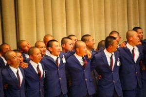 続いて野球部、ソフトボール部がステージに上がり、全国生徒が肩を組んで元気よく歌う「倉商校歌」や「桃太郎サンバ」を吹奏楽部の演奏で披露されました。2・3年生の大合唱により体育館のフロアーが大きく揺れ、1年生の皆さんは驚いていました。今後始まる「対岡山東商高校定期戦」応援練習の迫力を体感することができました。倉商には欠かせない「百(もも)さん」も一緒に応援し、1年生に紹介されました。5/12(火)第73回定期戦に向け、全校揃ってよいスタートが切られたと思います。この調子で、今年「4連覇」を目指して頑張りましょう!。