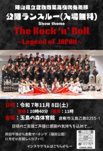 皆さま方のご支援とご声援を賜り、令和7年10月25日(土)広島グリーンアリーナで開催された第42回マーチング中国大会で、高校の部3校枠の1校として「全国大会出場」のご推薦をいただくことができました。今年、本校のテーマタイトルは「The Rock’n’Roll ~Legend of JAPAN~」日本のロック界を熱く牽引してきたレジェンド達を描いてみました。ロックをテーマにするマーチングは今回が初めて。感謝の気持ちを込め、今年も「公開ランスルー」開催をつぎのとおり計画しました。