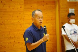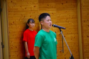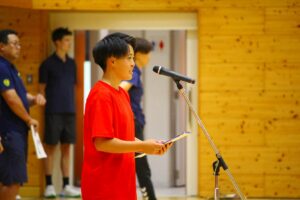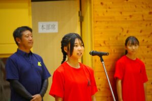 生徒会長さんからは、「倉商祭の最終日、放課後や空き時間を利用して練習や準備を積み重ねてきた。体育の部は勝ち負けを競う場でもあるが、例え順位が振るわなくても、皆で一生懸命頑張ったことや応援の様子はずっと思い出に残る。どんな結果であろうとも自分が思う最高のパフォーマンスを発揮できるよう頑張って欲しい。互いに頑張る仲間に盛大な声援を送りましょう。」と挨拶がありました。