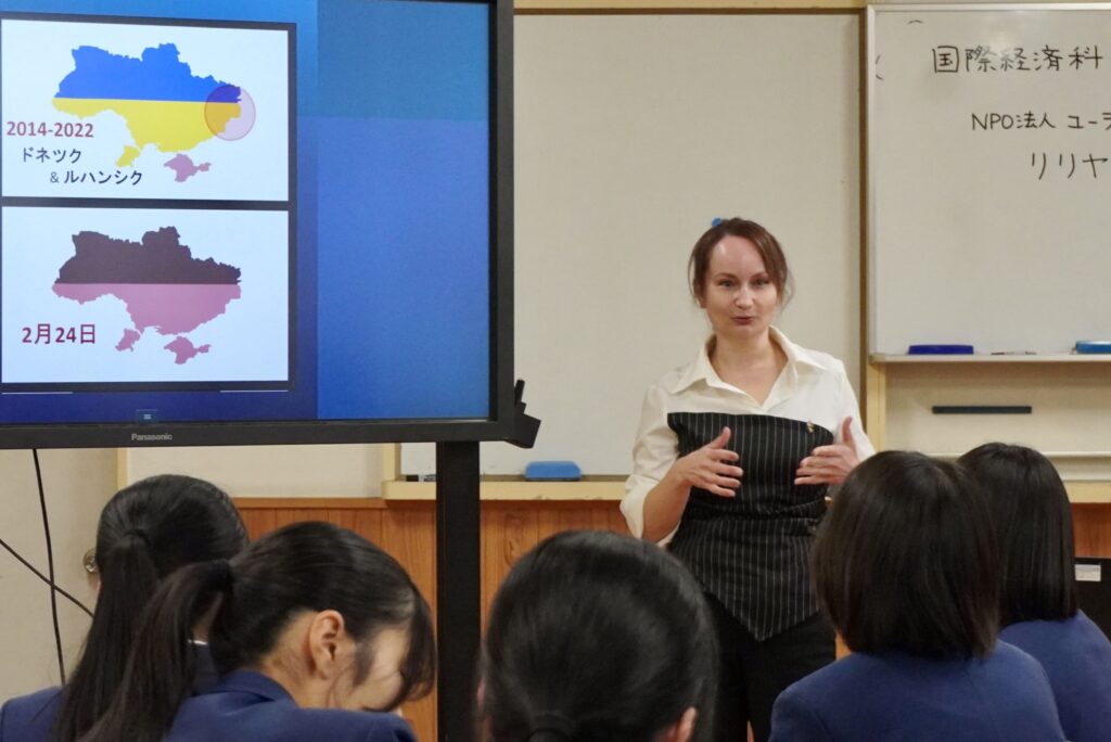 令和7年12月11日(木)、本校国際経済科3年生を対象に、NPO法人EURASIA 副理事長のリリヤ・バビィ氏を講師としてお迎えし、国際理解講座を実施しました。