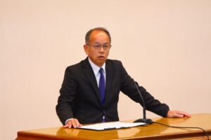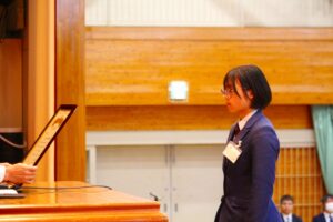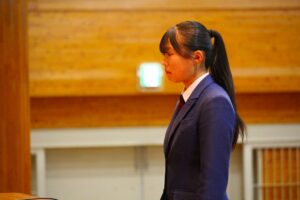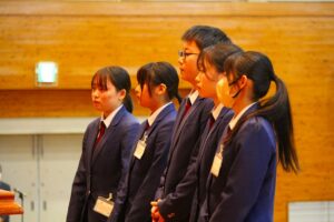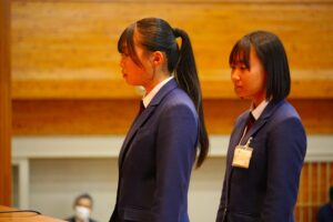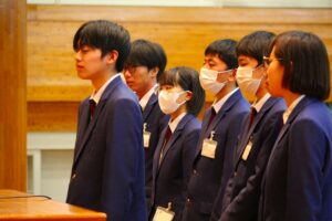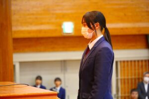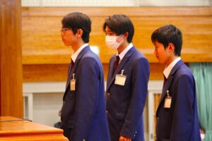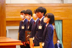 校長先生から「2学期始業式で、進路・倉商祭・検定など自分ばかりか周りの人たちと協力しなければならない場面が多くなる。皆さんは『6D(どうせ、でも、だって、だめだ、~できない)、3S(しょせん、~すべきだ、~しなければならない)』などのネガティブな言葉を避け、プラス思考の言葉を意識できたでしょうか。言葉には言霊が宿り、前向きな発信は人間関係をも円滑にできる。対人関係などで心に疲れを感じる時は、『優しさ』の対象に『自分自身』を加えてみて欲しい。他者を優先しすぎて自分を後回しにすると、心のゆとりが失われてしまう。自分に親切にできてこそ、他者にも真に優しくなれるはず。また、SNS等での攻撃的な言動が目立つ昨今であるが、大切なのは『たたくより、たたえあう』の精神である。見た目や断片的な情報で判断せず、相手の心情に寄り添い、寛容な輪を広げて欲しい。自分も他人も大切にし、穏やかな新年を迎えて欲しい。」と式辞を述べられました。