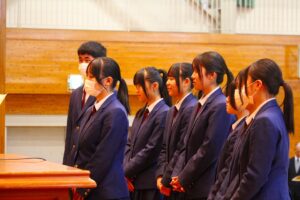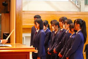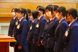 式辞後は、インフルエンザ警報の発令を配慮して、校歌を省略して2学期終業式を閉じました。年末年始は家族と共に過ごせるよい機会です。日頃できていない家庭での手伝いなどを積極的に取り組み、清々しい新年をお迎えください。