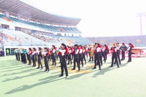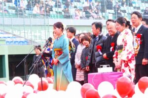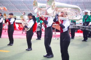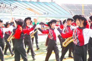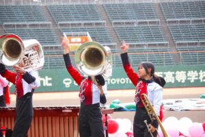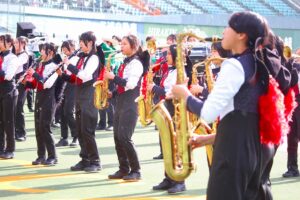 1/11(日)は倉敷マスカットスタジアムで「倉敷市二十歳の集い」が行われました。実行委員会より本校吹奏楽部へもオープニングセレモニーの演奏依頼があり、今年度二十歳を迎えられた皆さまに演奏でお祝いすることができました。会場は今冬に外野天然芝の張替え工事を行っているため、天然芝を全て剥がしており、今季最低気温となった会場は小雪が舞い、小嵐が砂塵を巻き上げ何度も会場を覆う状態でしたが、1年前から準備されていた実行委員会のみなさんの期待に添えられるよう、前日及び当日早朝のリハーサルで準備を行いました。