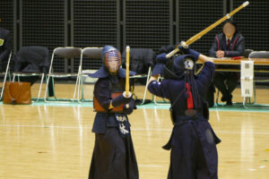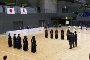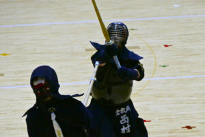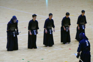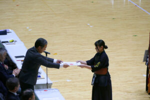 開会式では、昨年度の男子団体優勝校として、松浦太一主将が選手宣誓を行いました。女子団体は、今年度岡山県の代表は上位2校となるため、ベスト4の学校による総当りリーグ戦で行われました。決勝リーグの第1試合では、同点で大将戦を迎え、大将が2本勝ちをして勝利しました。第2・3試合では惜しくも敗退しましたが、第3位になりました。また、男子団体は、県新人大会に引き続き準々決勝で敗退し、惜しくもベスト8となりました。
