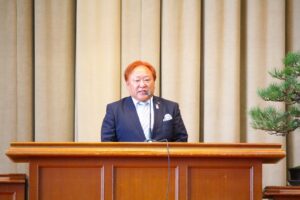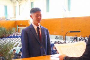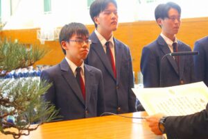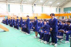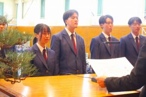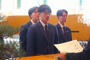 古市様からは「あの時の失敗が今の自分の支えになっている。3年間の友達を大切にして欲しい。次は二十歳になった時、倉敷アイビースクエアで予定されている『同窓会二十歳を祝う会』に出席して色々な思い出を語って欲しい。」と祝辞を述べられました。同窓会入会式では、すっかり恒例となった会長様のデビュー曲『神様は見ているよ』(←YouTube PVリンク)今年はご体調が悪く残念にもご辞退されました。リンクを貼ってご紹介いたします。同窓会からは卒業記念品が贈呈され、卒業予定者を代表して髙田晃大君が受領し、田中 紫さんから謝辞が伝えられました。来賓としてご出席の同窓会役員の方々と第77期のクラス及び学年幹事の紹介があり閉式となりました。