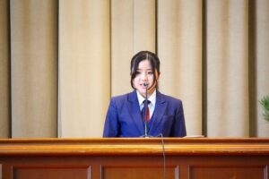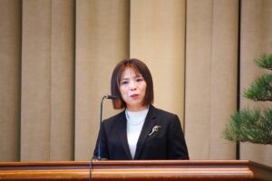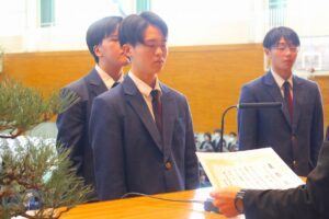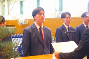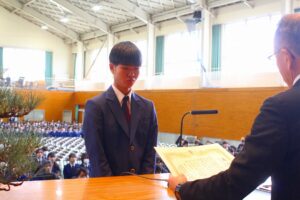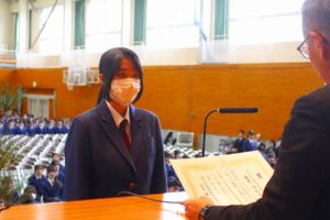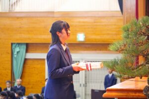 続いてPTA記念品贈呈式では、矢倉PTA会長様から卒業予定者を代表して原田えみりさんに卒業記念品が贈呈されました。「3年間頑張った検定資格取得。身につけた知識や技能を是非役立てて欲しい。3年間の努力に誇りを持ち、これからも挑戦し続けて欲しい。」とご祝辞を賜りました。