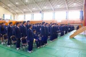 第77回卒業証書授与式を控えその予行が行われました。予行に先立って「同窓会入会式」が古市同窓会長様をはじめ6名の同窓会役員の方々のご臨席のもと行われました。