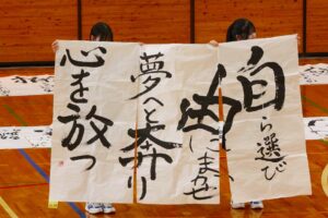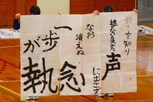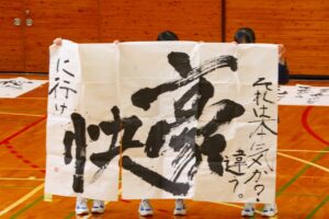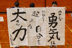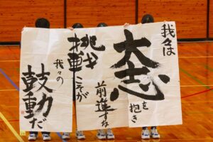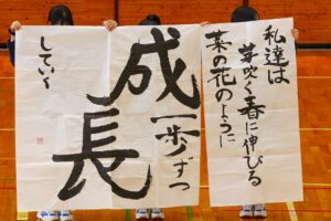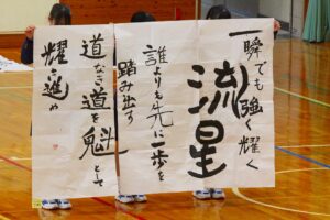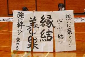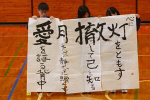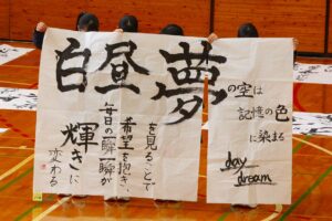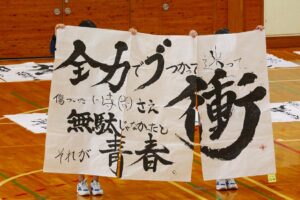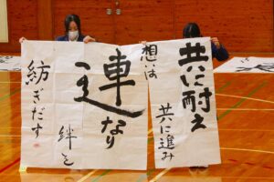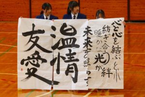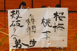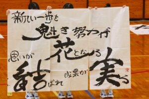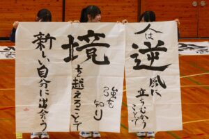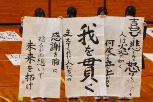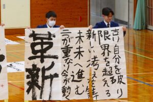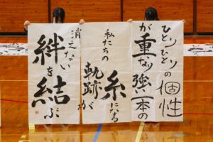 『書道』では、クラス毎に作品テーマが設定され、グループ毎にその関連作品として作成されました。作品説明はクラス毎に発表され、独特の書体で表現されています。