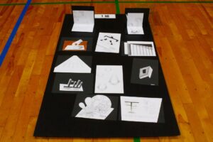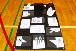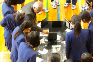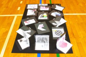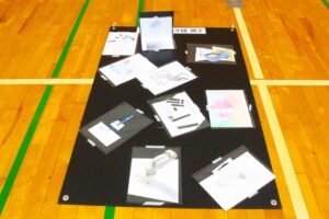 『美術』では、平面に描いた絵をある方向からカメラ越しに見ると立体的に見える「トリックアート」が展示されました。生徒は、個々の作品を特定の方向から写真撮影してその効果を確認しました。が現れます。各自所有のChrome Book等を使用し、その効果を確認しました。