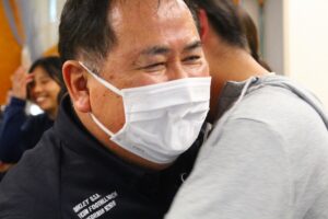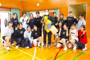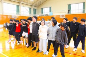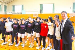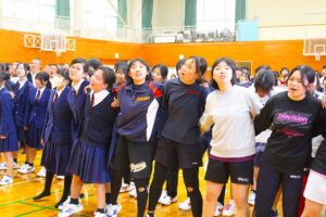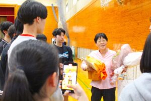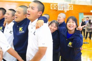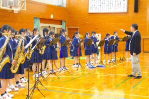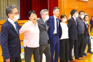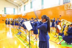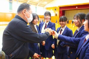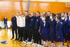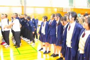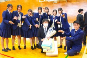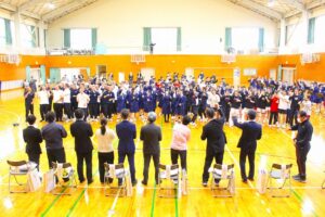 別れを惜しみ卒業生や部活動をしていた多数の生徒がセレモニーに駆けつけて、在校生と共に吹奏楽部の演奏で、「校歌」と「桃太郎サンバ」を合唱して転退任の先生方をお送りしました。