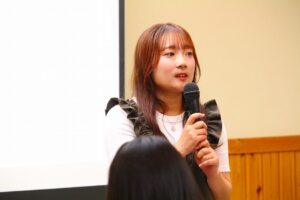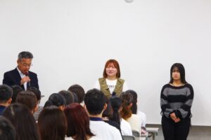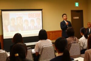 生徒会長から「緊張すると思うが、全力で取り組み、楽しんできてほしい。」と激励の言葉を述べました。商業研究部を代表して三宅さんから「せっかく掴んだこのチャンスを最後まで頑張りたい。」と抱負が述べられました。商業研究部の皆さん、しっかり頑張ってきてください。