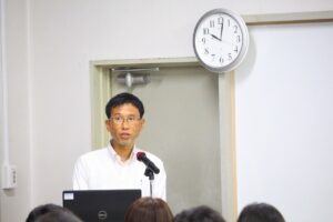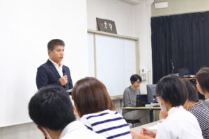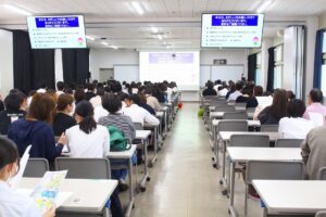 最初に「新任式」が行われ、2学期より新たに国語科とALT(外国語指導助手)の2人の先生がご紹介されました。続いて「始業式」では、校長先生から「3年生にとって進路実現に向けた勝負の時期を迎えた。2学期のスタートにあたり、次の2点について伝えたい。まず、1点目は、本校で身に付けてほしい5つの力です。①傾聴力(相手の話をよく聞く)②共感力(相手の気持ちに寄り添う)③伝達力(考えを分かりやすく伝える)④企画力(課題を整理し解決へ導く)⑤突破力(失敗を恐れず挑戦する)です。授業や部活動を通じて意識的に磨いて欲しい。2点目は、日頃の言葉遣いです。『言葉』には『言魂』が宿ると言われる。“どうせ”、“でも”、“しょせん”、などの『6D3S』のネガティブ言葉は自分や周囲を後ろ向きにしてしまう。代わりに、“きっとできる”、“大丈夫”といったプラス言葉を使うことで、気持ちや人間関係も前向きになる。困った時は一人で抱え込まず相談し、みんなで躍動・躍進・感動の2学期にしていきましょう。」と式辞を述べられました。